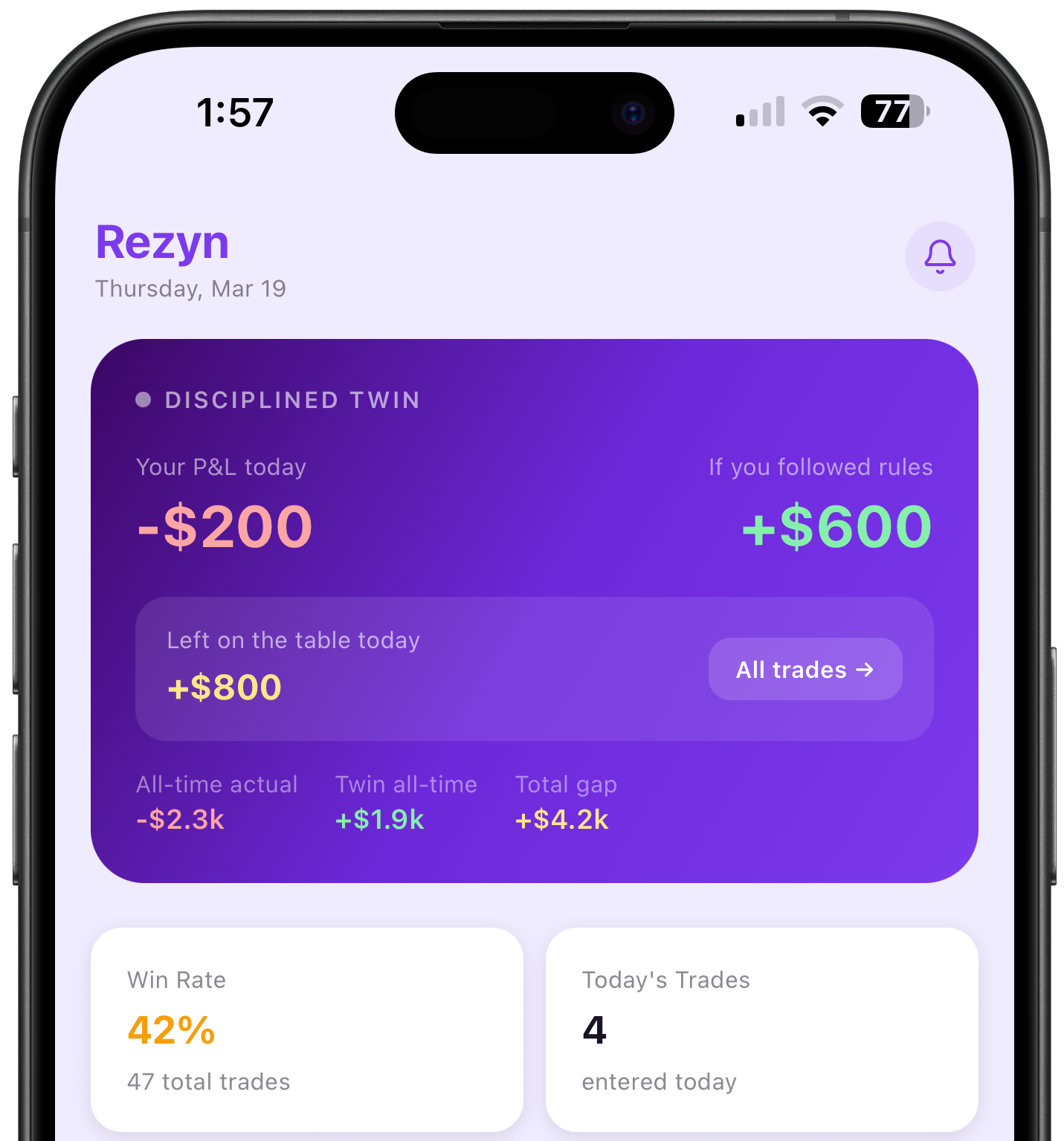 Every trade you take outside your rules has a price. Rezyn runs a parallel performance tracker that calculates exactly what you would have made if you followed every rule — and shows you the gap in real time.